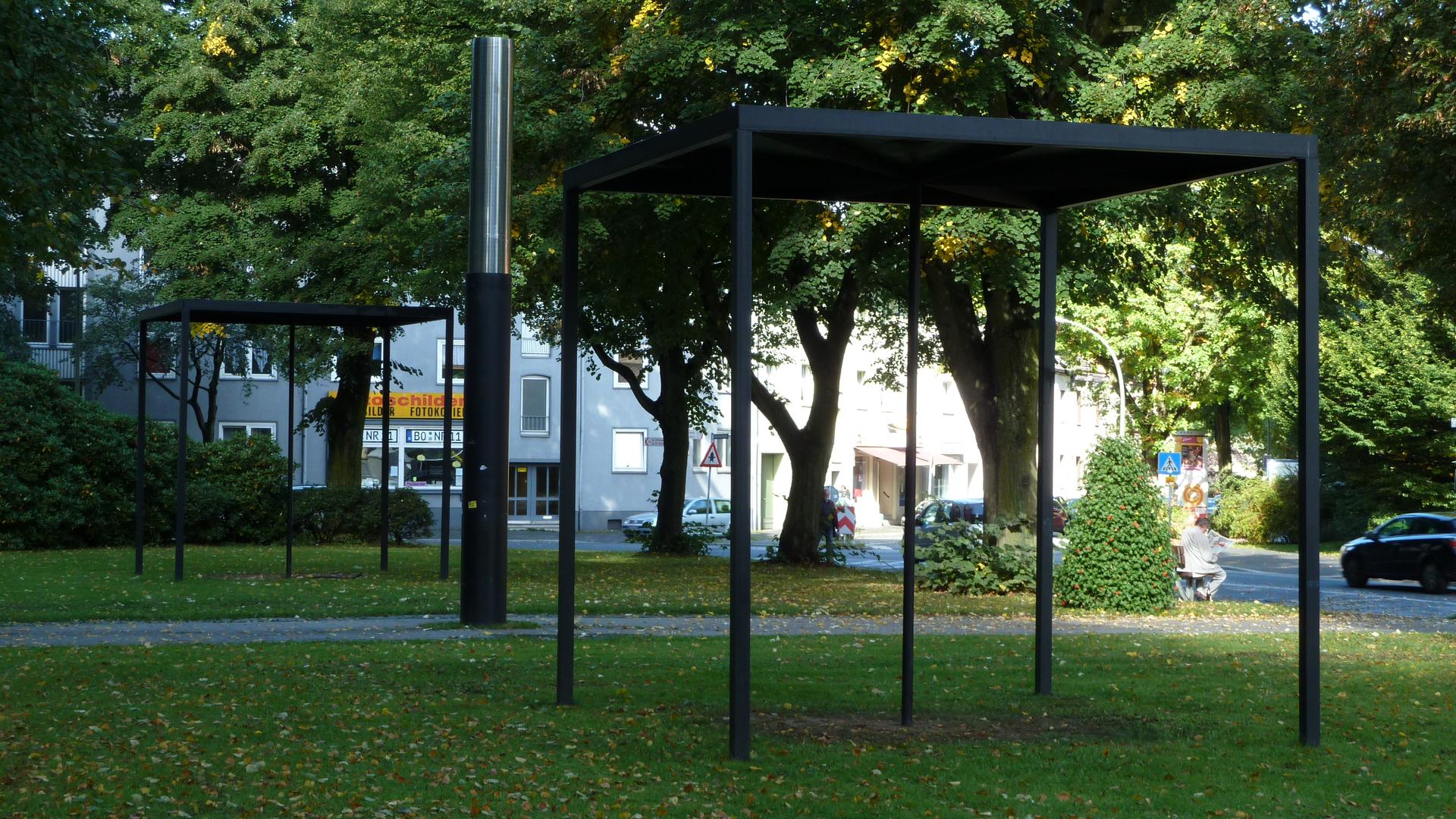 Ein ökokinetisches Objekt. Für die Atmende Säule sind zwei 8 m hohe Stahlblechrohre so ineinandergefügt, dass sich die innere Edelstahlröhre durch unterschiedlichen Wasserdruck von unten hebt und senkt. Die Mechanik wird vom Regenwasser bewegt, das in zwei 4 * 4 m großen, pavillonartigen Auffangbecken gesammelt wird. Die Auffangbecken sind über ein kommunizierendes Röhrensystem mit der Säule verbunden. Der mit dem gesammelten Regen steigende Druck hebt die innere Säule, bis am obersten Punkt ein Ventil geöffnet wird, dass das Wasser ausströmen lässt. Der Prozess beginnt von vorn.