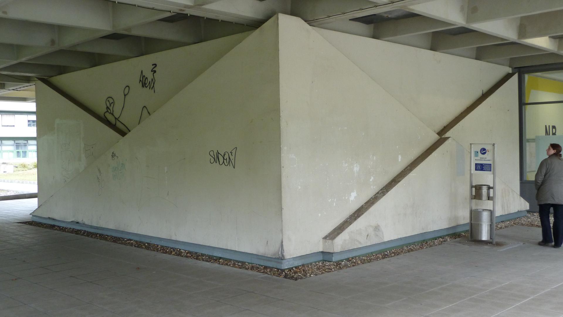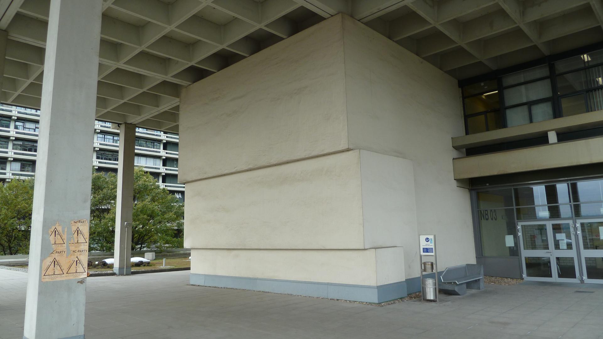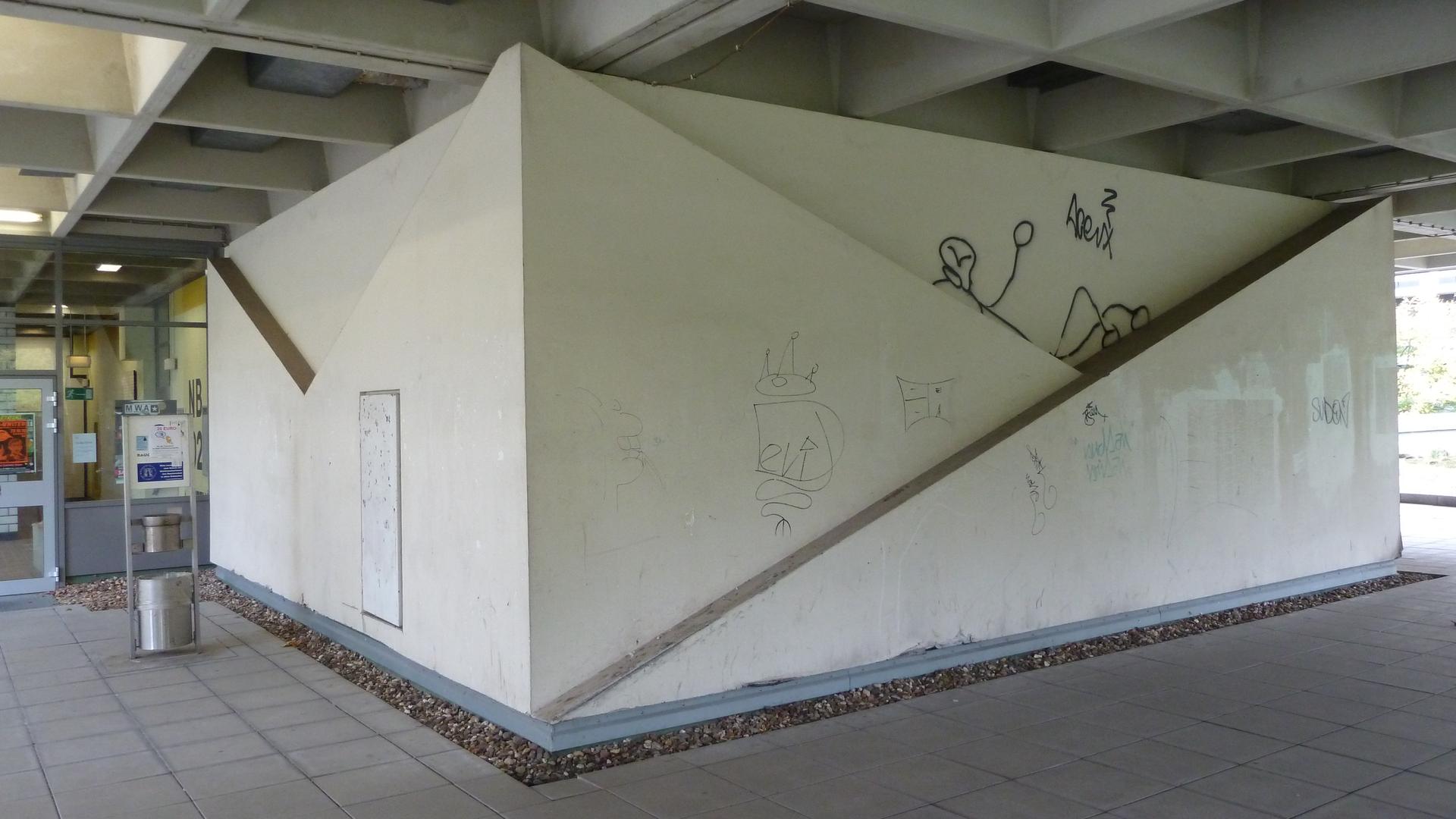 Jos Manders setzte glatte Wände mit abgerundeten Ecken vor den Versorgungskern NC-Nord. An einer Ecke schwingen die Wände nach innen und bilden einen Hohlraum. Dort sollte eine akustische Installation angebracht werden, die nicht realisiert wurde.