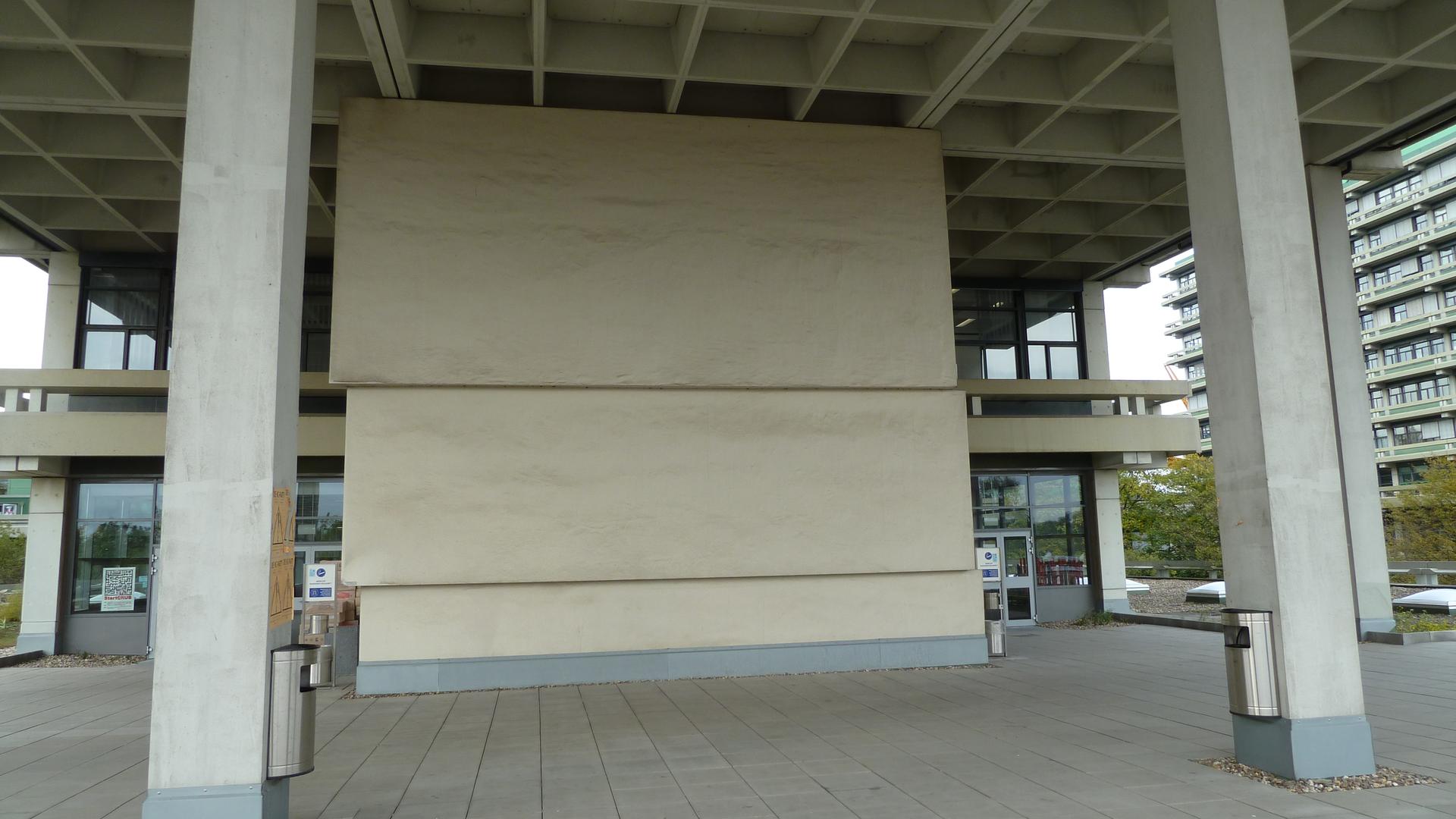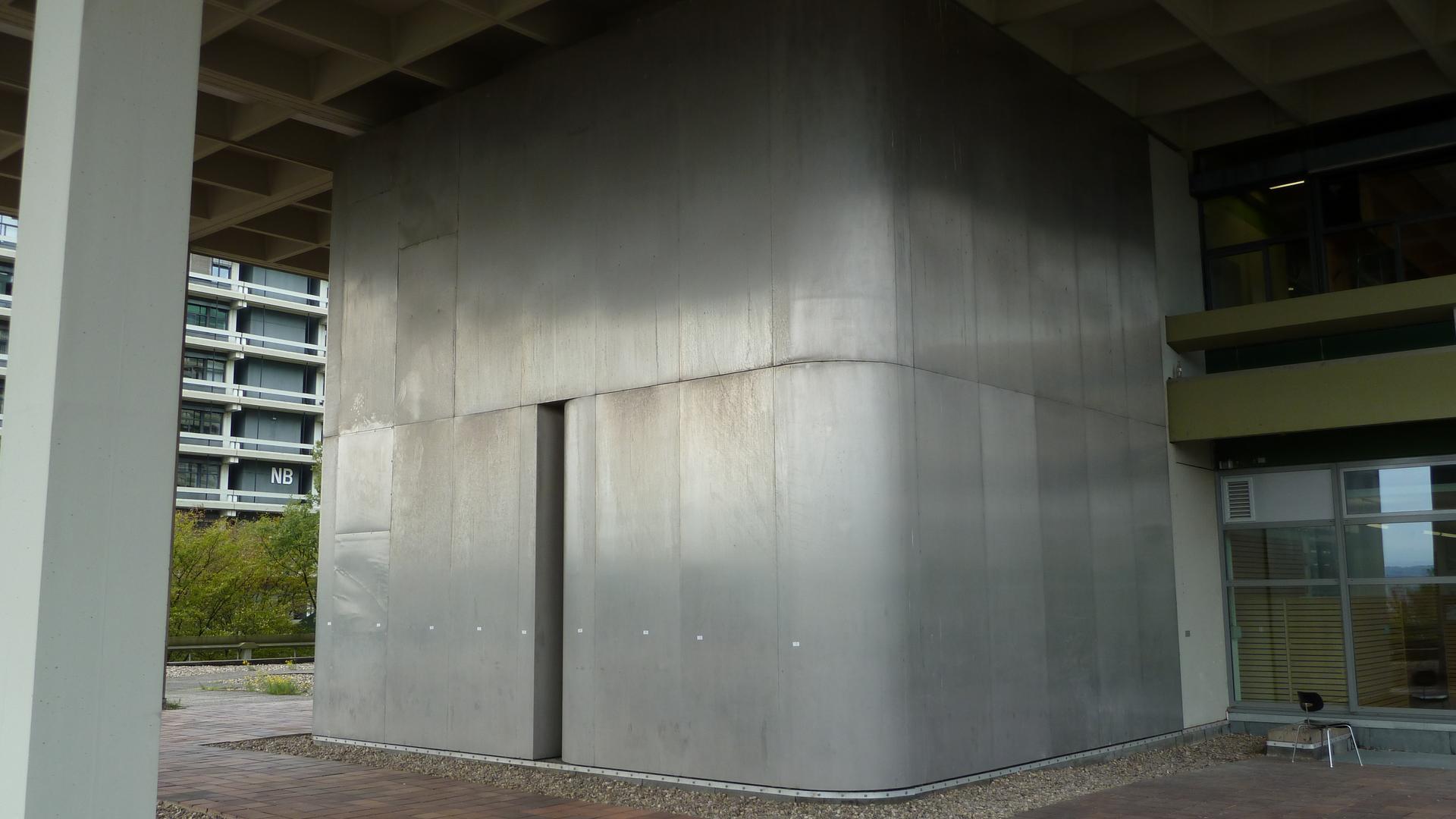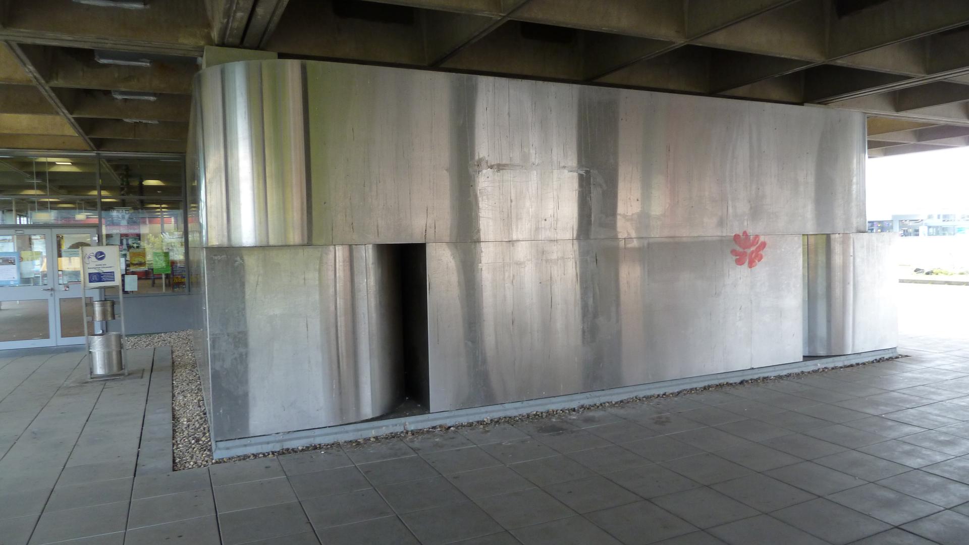 Jos Manders setzte glatte Wände mit abgerundeten Ecken vor den Versorgungskern NC-Nord. An einer Ecke schwingen die Wände nach innen und bilden einen Hohlraum. Dort sollte eine akustische Installation angebracht werden, die nicht realisiert wurde.