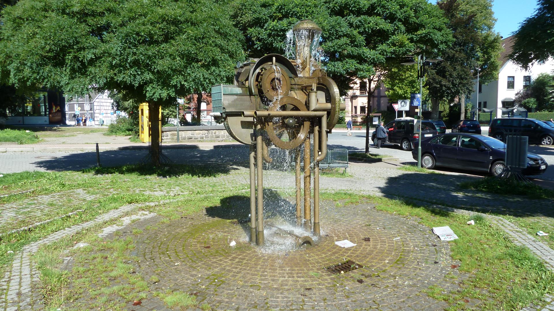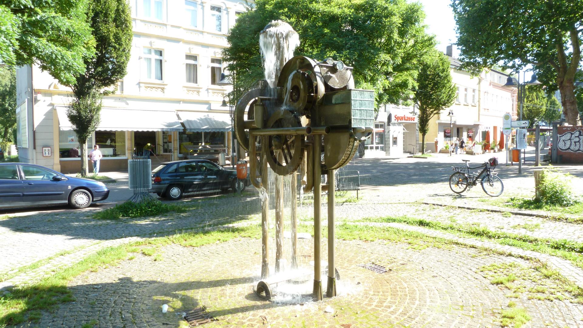 Der Brunnen vor dem Bahnhof Dahlhausen in der Nähe des Eisenbahnmuseums widmet sich dem Thema „Lokomotive“. Weil er vom Wasser angetriebene bewegliche Teile hat, heißt er Lokomobile - nicht zu verwechseln mit den gleichnamigen, vor allem landwirtschaftlich genutzten Dampfmaschinen, den Vorläufern der Traktoren. Ursprünglich sollten Lokomotivteile wie Kolben und Räder durch den Wasserdruck angetrieben werden.