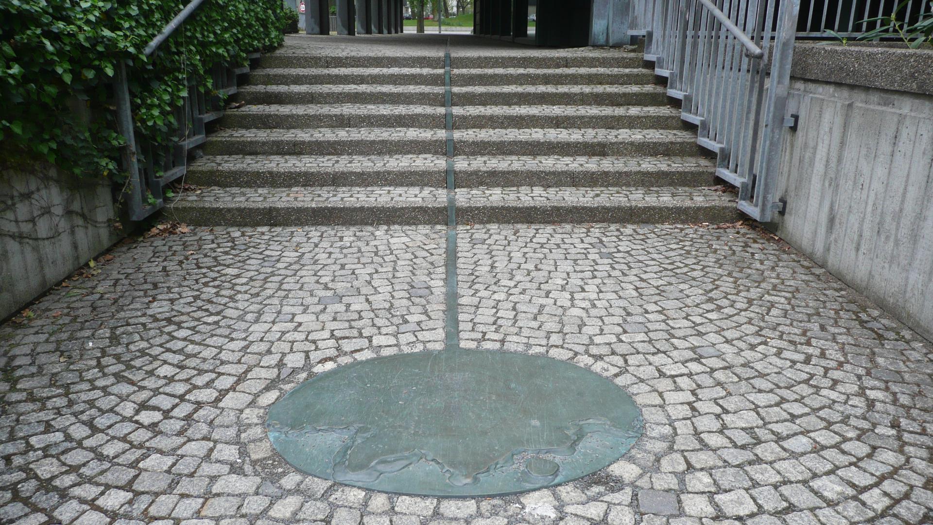 Jiri Hilmars Bodenplastik in der Treppenanlage vor dem Kunstmuseum Bochum ist verborgene Kunst: Das Kunstobjekt ist nicht auf den ersten Blick als solches erkennbar. In dem Kleinpflaster der Terrasse vor dem Museum der Treppe ist eine Bronzeschiene verlegt, die auf eine Treppe zu und über die Stufen hinab auf eine Bronzescheibe führt .