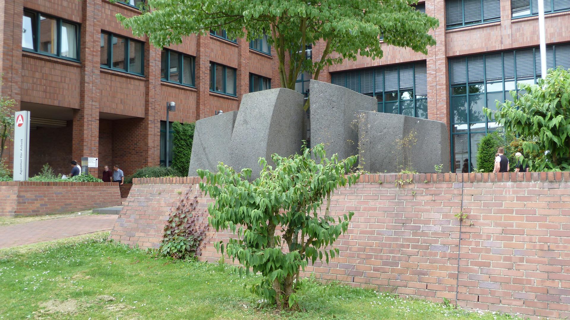 Kunst am Bau ist das Spezialgebiet des Hagener Bildhauers Klaus Herleb. 1985 entwarf er die Steinskulptur für das Arbeitsamt (heute: Agentur für Arbeit) Bochum. 140 Tonnen schwer, mannshoch. Große Sachen, meterlang und -hoch, „die kann man nur im Modell machen“, sagt Herleb. Keinem Bau hat er seine Kreativität aufgepfropft, er hat sie in ihn integriert. Mit dem Ansinnen, Aufgaben des zu gestaltenden Hauses widerzuspiegeln.