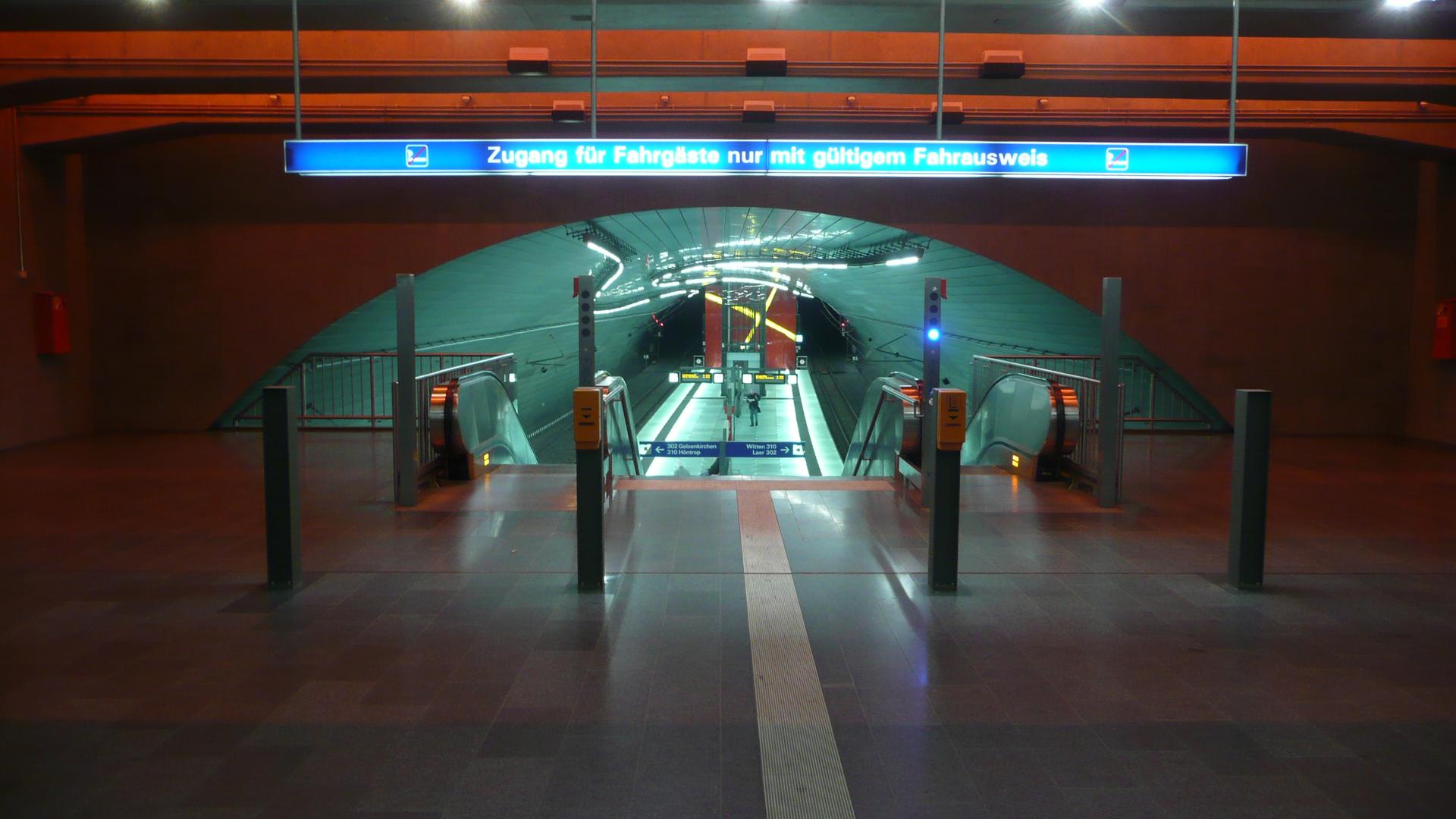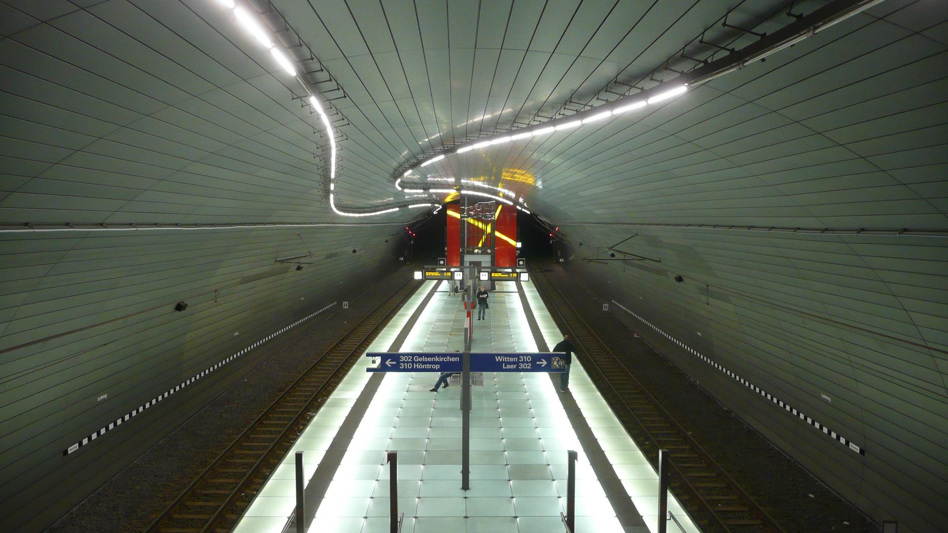 Holger Rübsamen: Ausgangspunkt war im konkreten Fall des U-Bahnhofs Lohring dieser beeindruckende unterirdische Raum, ein leicht geschwungenes, rund 100 Meter langes Gewölbe. Wir fanden schnell die auf wenige Aussagen reduzierte architektonische Konzeption - der freie Blick in den durch Einbauten unberührten Raum, ein beleuchteter Glasboden, darauf alle technischen Einrichtungen, am Ende als Raumbegrenzung die rote Wand. Der Gedanke, dass der Abstraktionsgrad dabei vielleicht zu groß werden könnte, hat uns dann zur Zusammenarbeit mit Eva-Maria Joeressen geführt, zumal wir zuvor schon bei anderen Projekten die Kooperation mit Bildenden Künstlern gesucht hatten. Eva-Maria Joeressen hat die Konzeption des gelben Lichtkreuzes auf roter Wand und die in Korrespondenz zum beleuchteten Glasboden stehenden Lichtlinien am Gewölbe entwickelt. So verweist zum Beispiel das Lichtkreuz als Abbildung der oberirdischen Kreuzung auf die Verortung des Topos: „102 Meter üNN“, während die Lichtlinien die Bewegungsabläufe der Menschen und der U-Bahn-Züge reflektieren. Später haben wir den Komponisten Klaus Kessner gebeten, sich mit der erstaunlichen Akustik des Raumes zu beschäftigen. Es ist eine Klanginstallation entstanden, deren akustisches Material sich ausschließlich aus dem Ort formiert und die dieses in immer neuen Varianten wiedergibt.