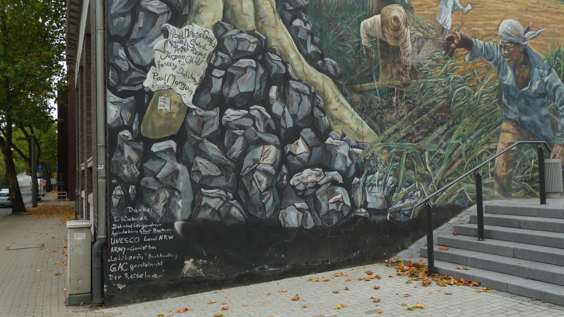 Themen des Wandbildes sind die Verzahnung von Vergangenheit, Gegenwart und Zukunft, genauso die Unterschiede und Gemeinsamkeiten der gesellschaftlichen Entwicklung an so weit auseinanderliegenden Orten wie Bochum und Cuba und die Arbeit, die das Leben der Menschen prägt und die Gesellschaft formt.