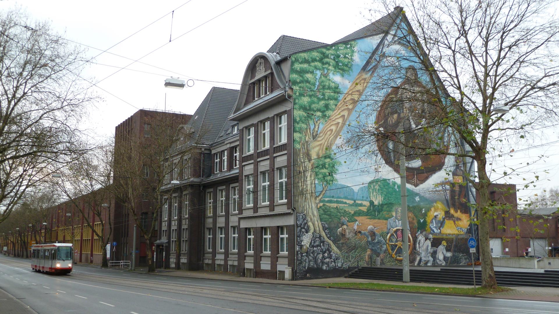 Das 450 m² große Wandbild am Torhaus 5 zeigt auf sinnfällige Weise die nicht immer liebevolle Beziehung zwischen Mensch, Technik und Natur.