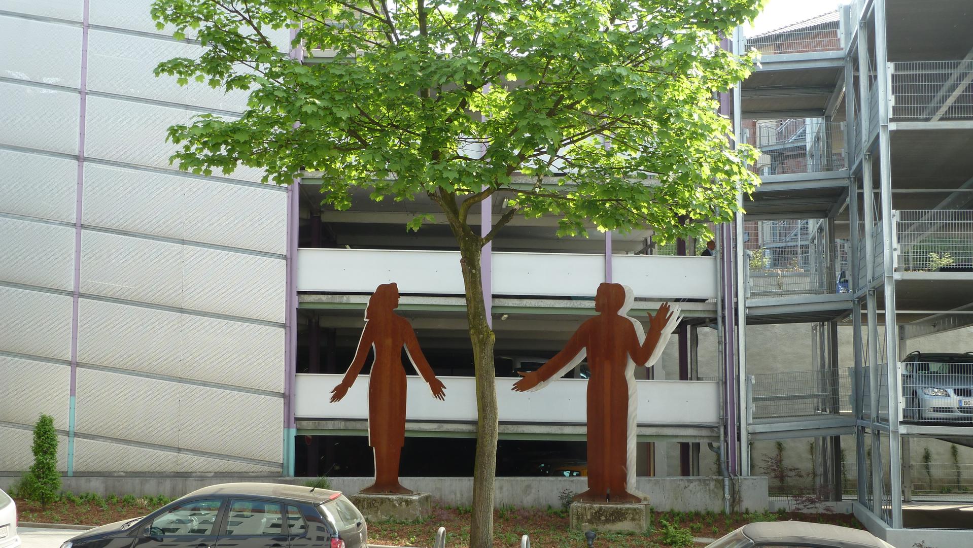 Vor dem Parkhaus an der Bergstraße stehen zwei Figuren, eine männlich eine weiblich, gestaltet wie ein Scherenschnitt. Die Figuren werden von einer Schattengestalt begleitet. Während die begleitenden Figuren in glänzendem Edelstahl ausgeführt sind, bestehen die Figuren im Vordergrund aus schwerem irdischem Stahl, der die Spuren der Verwitterung zeigt.