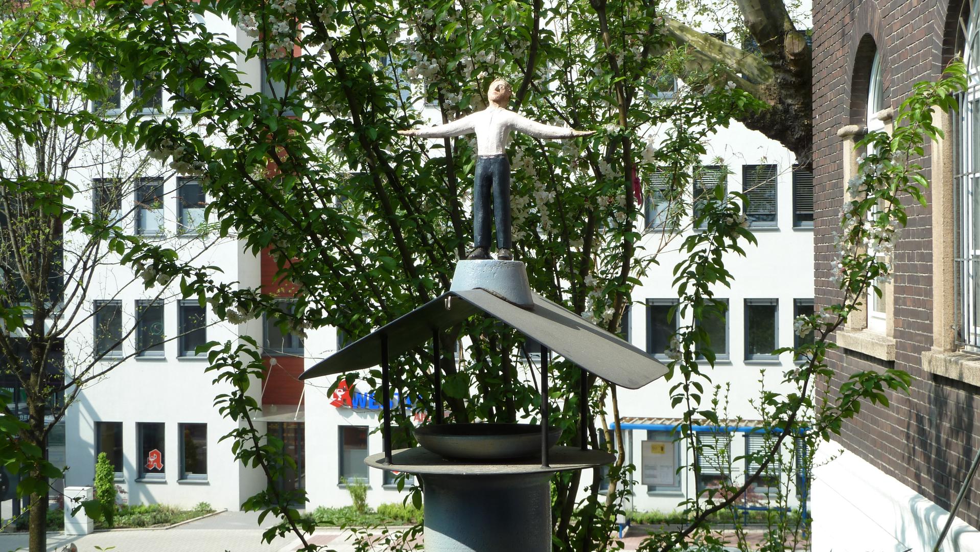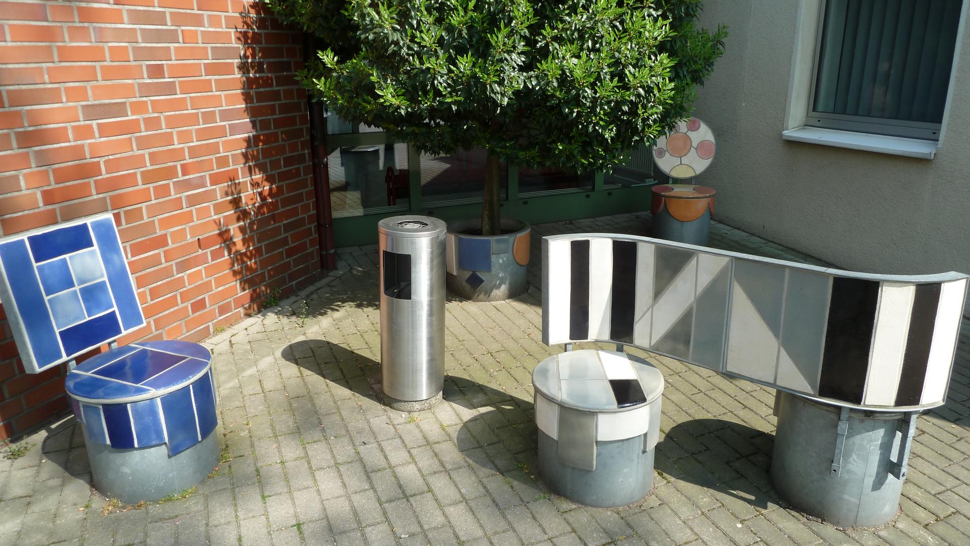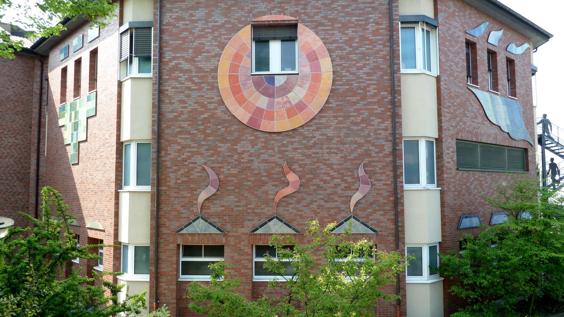 Seit über zwanzig Jahren gestaltet Jochen Schimpfle-Andresen Fassaden und Plätze der Augusta-Kranken-Anstalt Bochum mit seinen vielfältigen Erfindungen aus glasiertem Ton, Stahl und Aluminium.