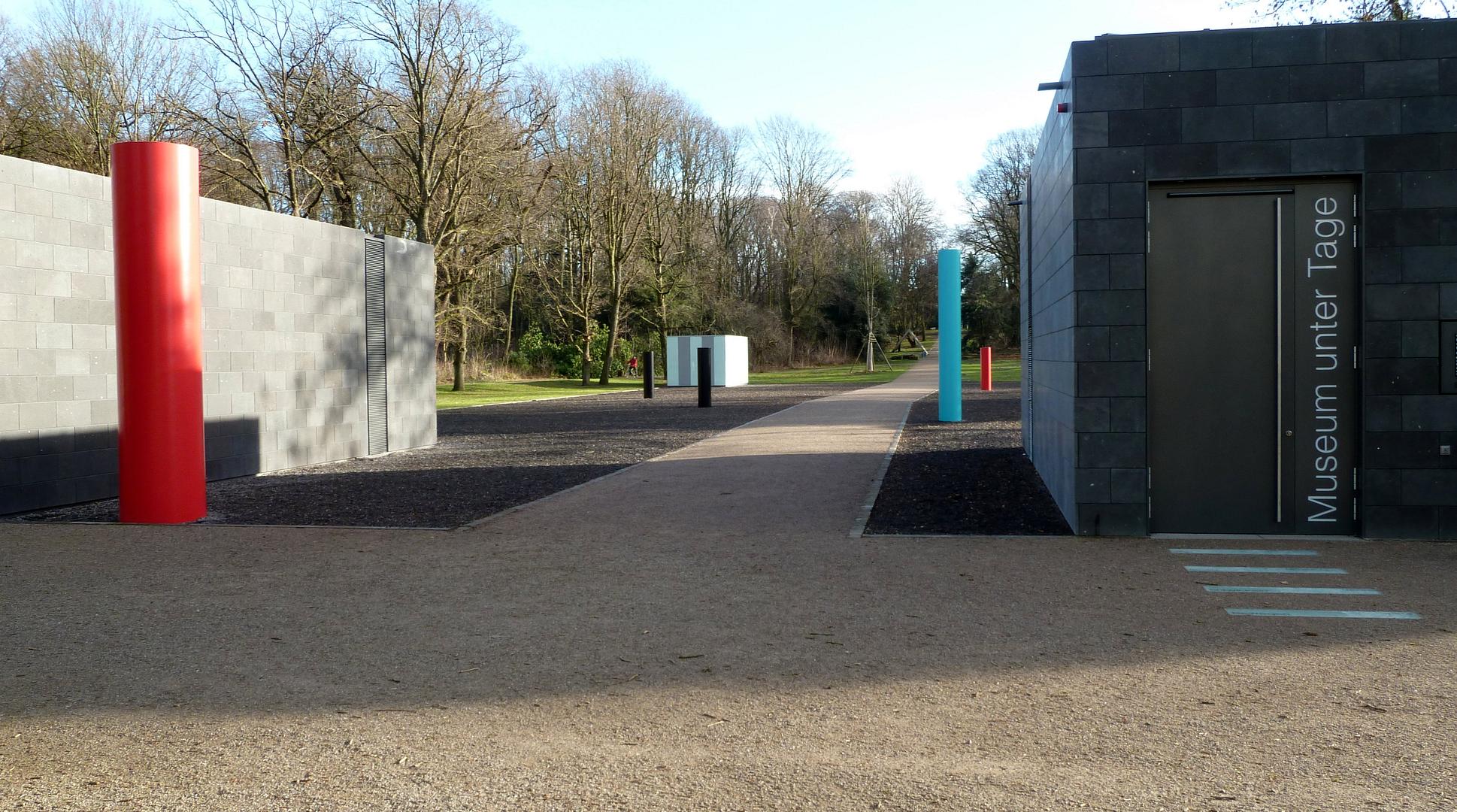 Auf der durch schwarzen Basaltsplit akzentuiertem Fläche des Museums unter Tage stehen fünf unterschiedlich hohe Stelen aus Stahl in rot, blau und schwarz. Drei der vier Ecken des unterirdischen Gebäudes sind durch Pavillons markiert. Die beiden schwarzen Kuben sind für Eingang und Gebäudetechnik erforderlich, der dritte - wie der Kubus im Haus Weitmar mit einer gläsernen Verkleidung versehen - dient als Notausgang.