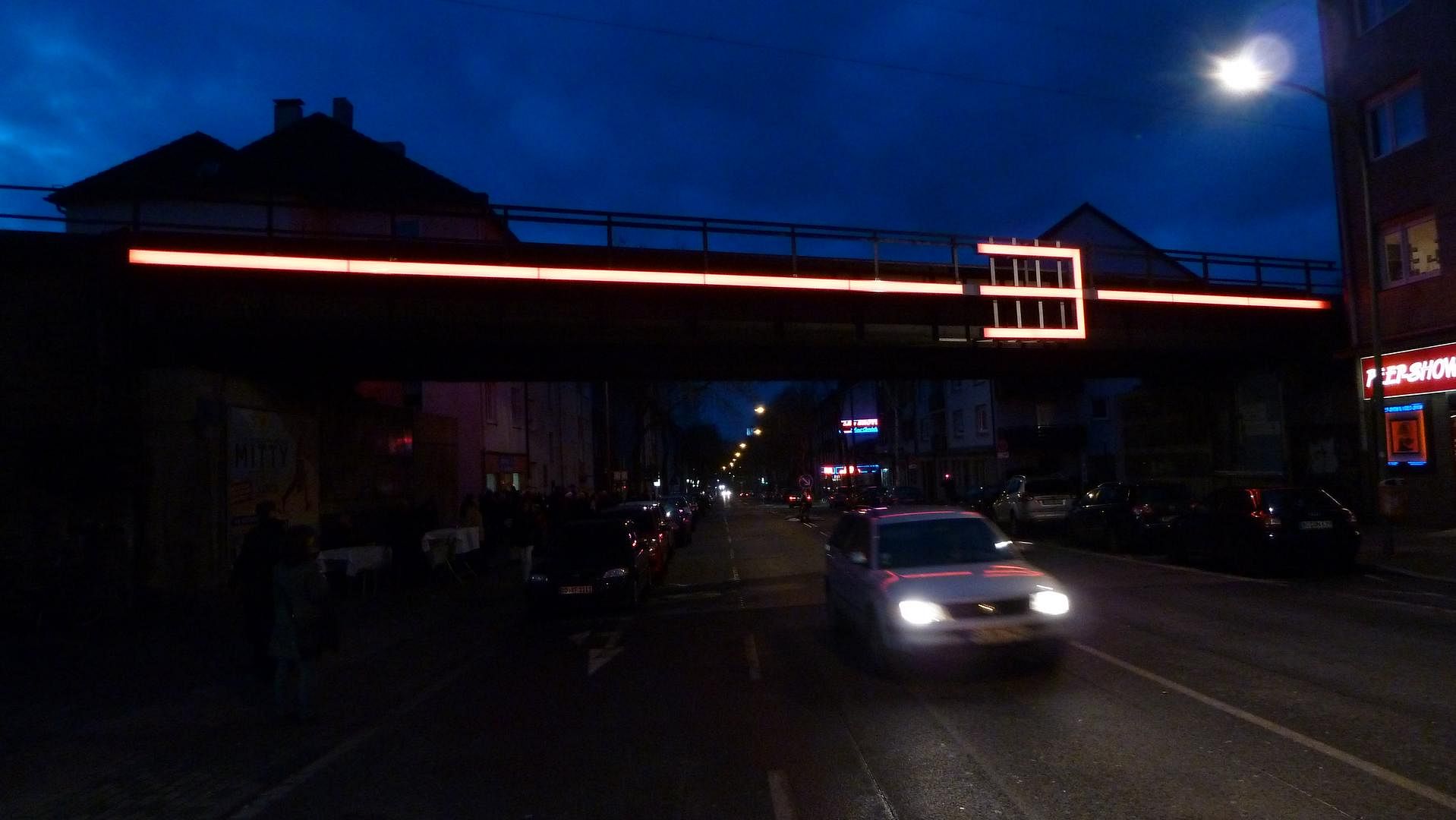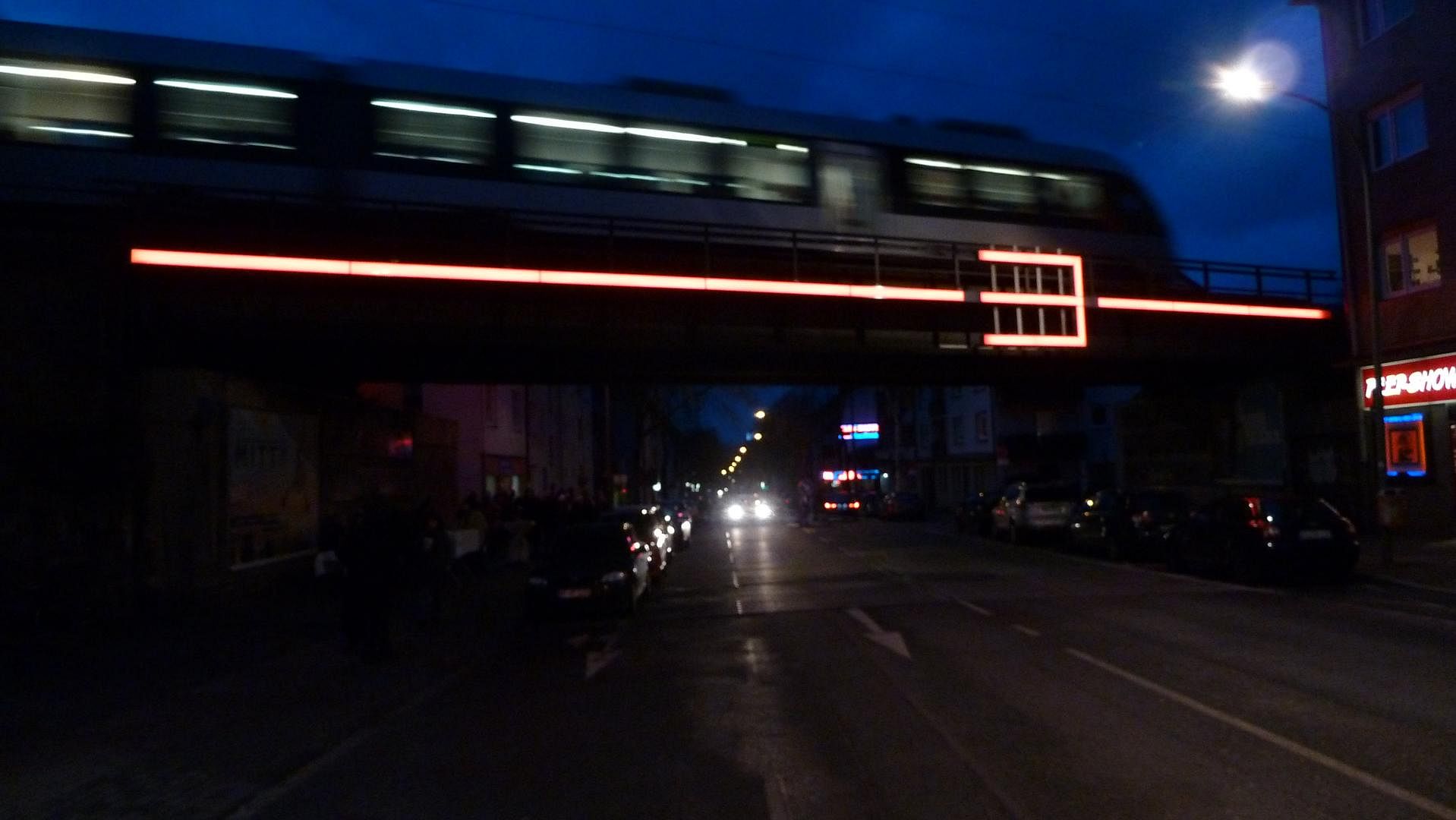 Im Vergleich der Realisation mit dem Entwurf ist leicht zu erkennen, dass nur der zweite Schritt tatsächlich ausgeführt wurde. Die Unterleuchtung der Brücke und die Beleuchtung der horizontal ausgerichteten Metalltafeln fehlen - aus Kostengründen.