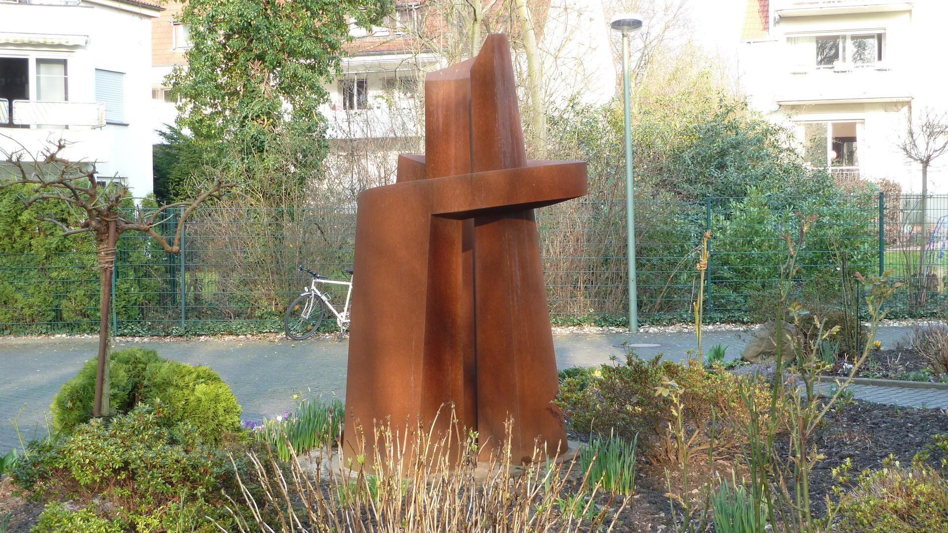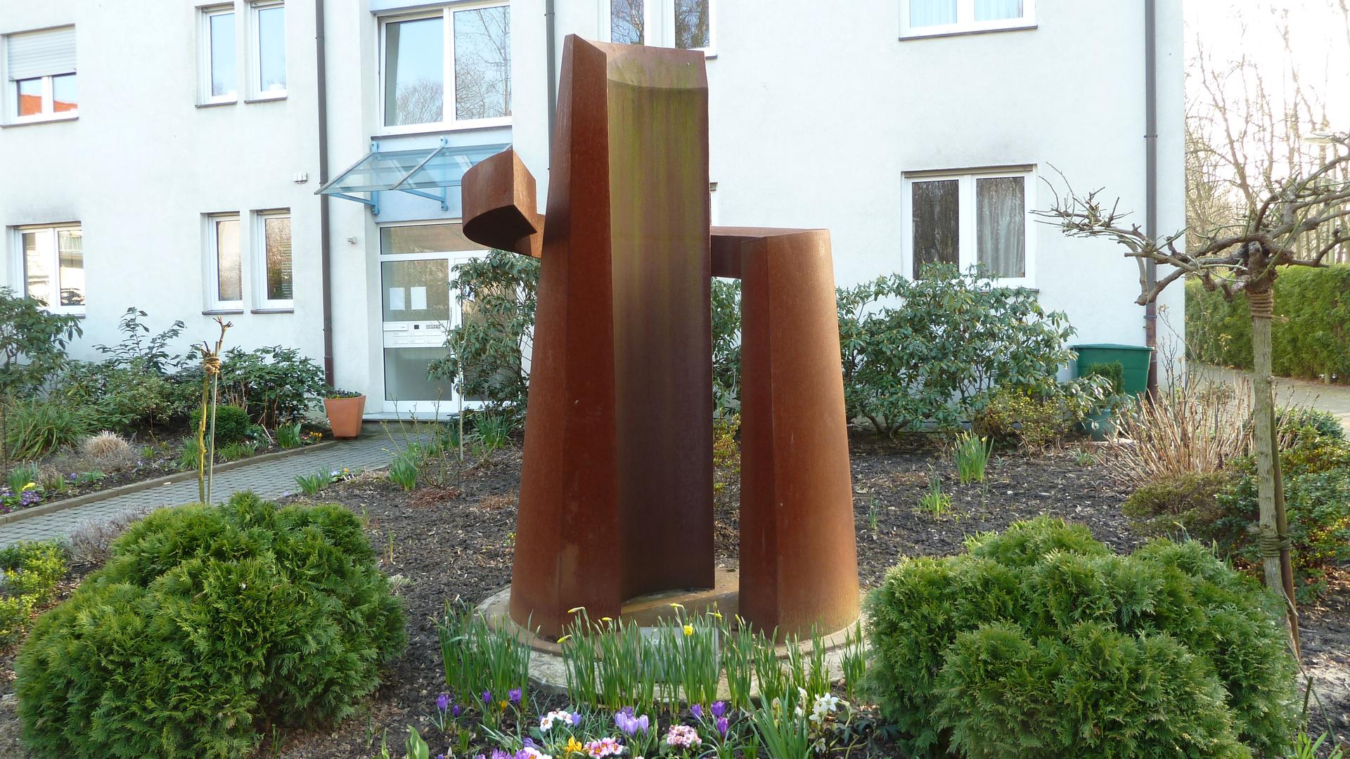 Die zweiteilige Plastik „Schraube“ nimmt das Motiv der Holzschraube mit dem konischem Schaft und dem wendelförmig aufsitzenden Gewinde auf. Als Referenz an den Stahlstandort Bochum und das Terminal von Richard Serra ist die Plastik aus CorTen-Stahl mit der typischen rostfarbenen Oberfläche gefertigt.
