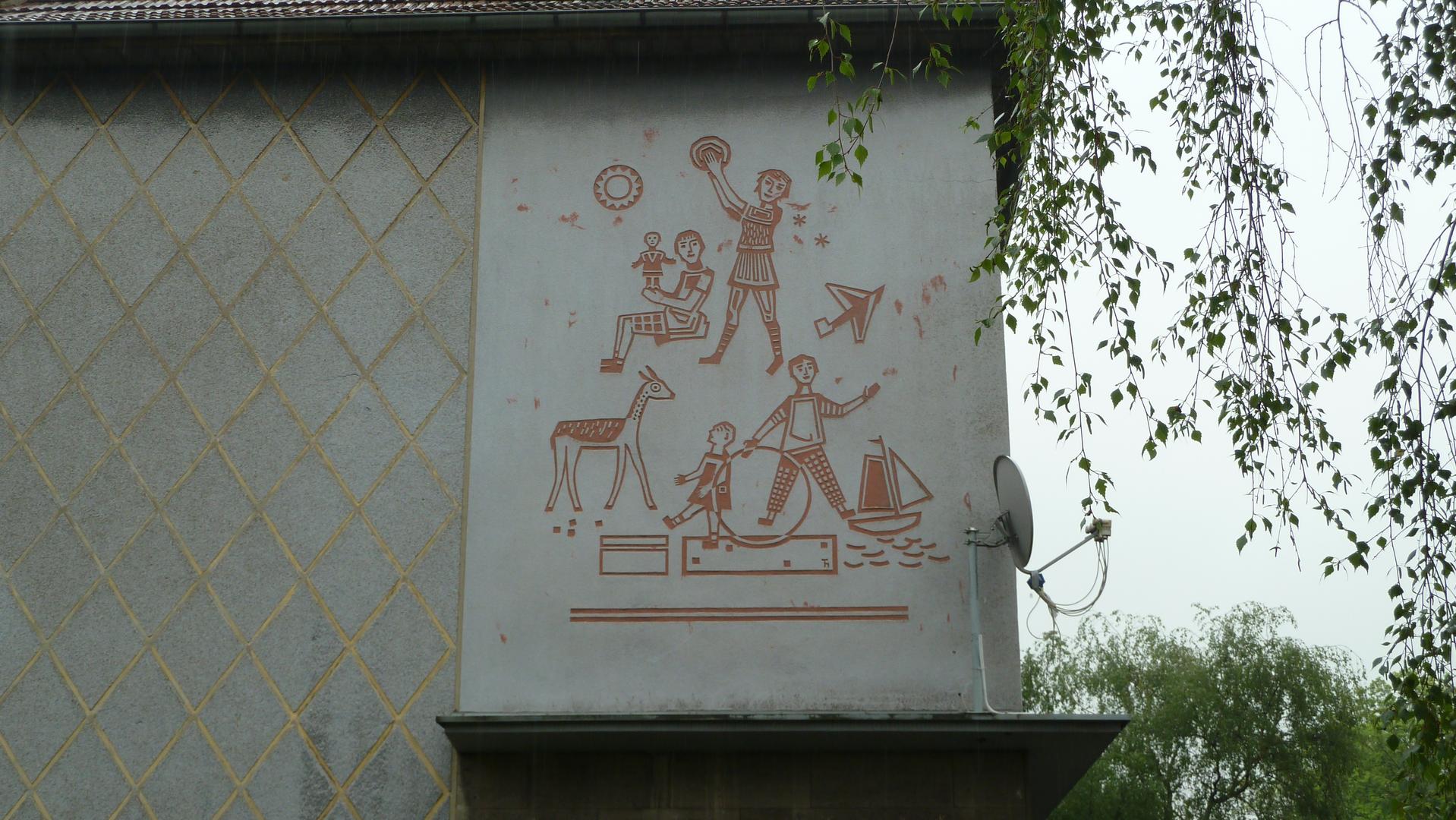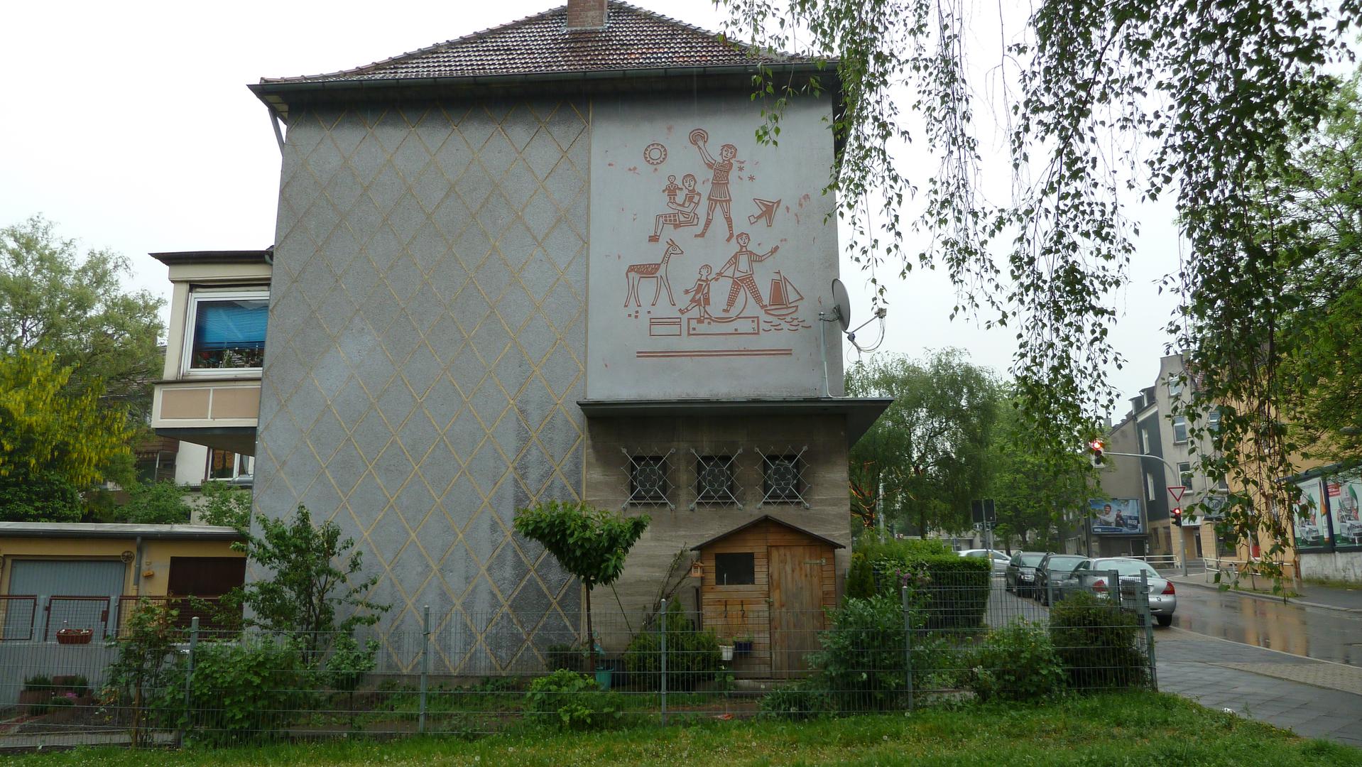 Das Sgraffito im klassischen Stil der 1950er Jahre ist thematisch auf die benachbarte Wilbergschule bezogen. Es zeigt spielende Kinder mit einem Reh als Symbol der Natur, aber auch ein Flugzeug und ein Segelschiff. Die Darstellung wirkt in ihrer geometrischen Strenge ein wenig zu ernsthaft und steif. Das Sgraffito des unbekannten Künstlers ist signiert mit der Ligatur „Th“.