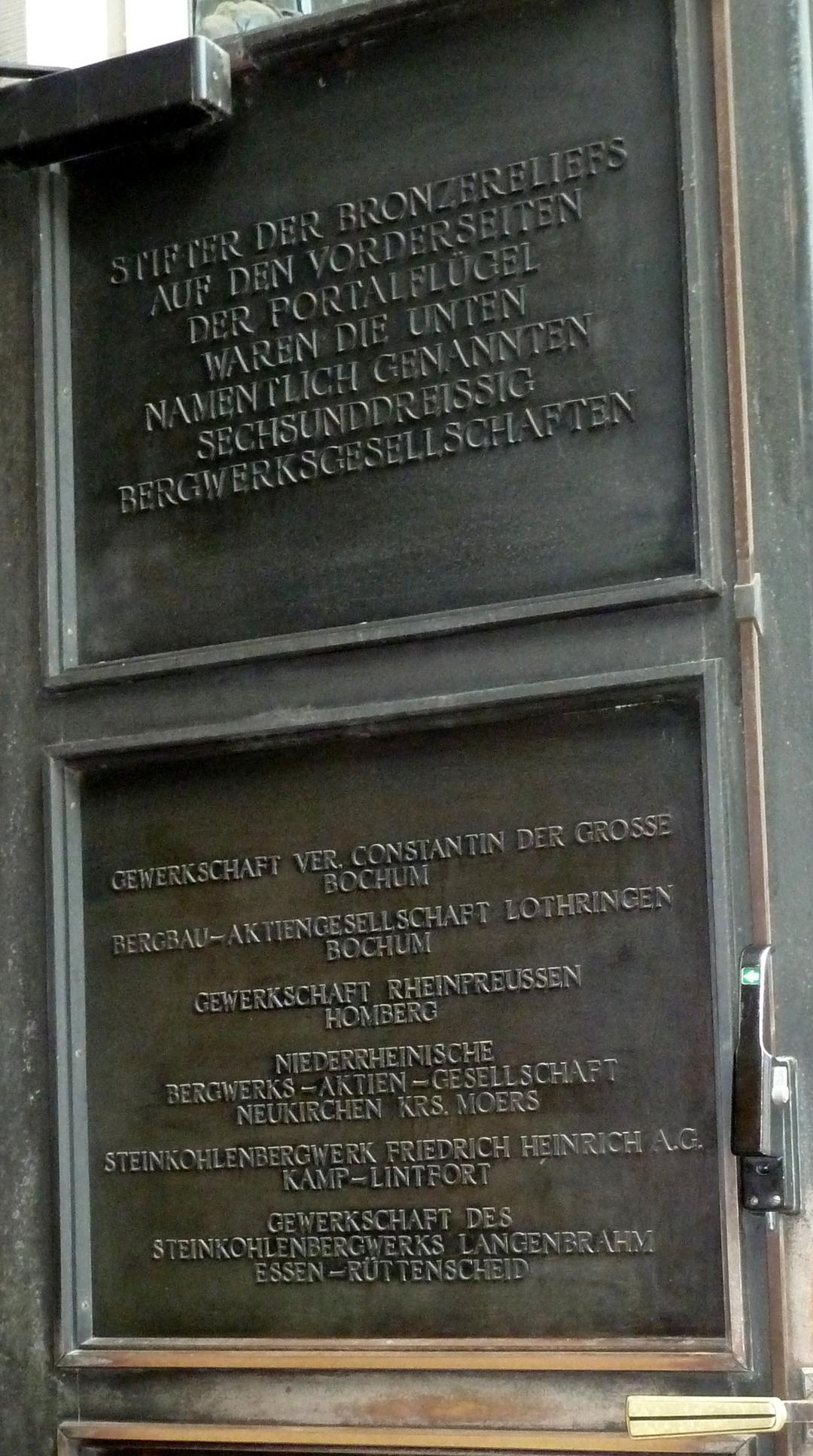Die drei wuchtigen Doppeltüren am Haupteingang zum Deutschen Bergbau-Museum tragen dreißig Bronzereliefs zu Themen und Geschichte des Bergbaus. Nicht weniger als sechsunddreißig Bergwerksgesellschaften haben durch ihre Spenden das Bronzeportal finanziert. Im Jahr 1953 wurden die von den Düsseldorfer Bildhauern Otto Bussmann und Maria Schlüter gestalteten Reliefs in die Portale eingelassen.