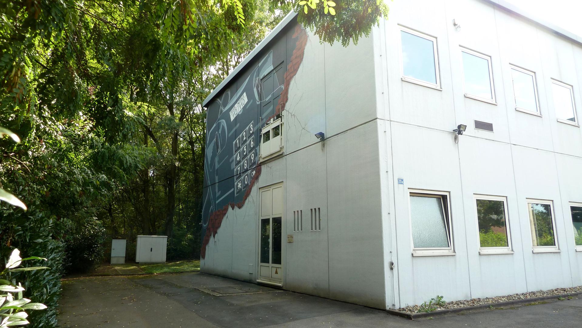 Sehr versteckt, fast unsichtbar, befindet sich ein bemerkenswertes Stück Illusionsmalerei an der südöstlichen Ecke der Telekom Umspannanlage an der Ottostraße. Das Gebäude ist nur über die Zufahrt zu den Gewerbebetrieben hinter Haus Nr. 16 zu erreichen. Das Wandbild ist erst zu erkennen, wenn man die der Zufahrt gegenüberliegende Querwand erreicht hat. Ganz offensichtlich war das Wandbild auf die Ansicht von der Kreuzung Ottostraße / Berliner Straße her entworfen. Mittlerweile verdeckt aber dichter Pflanzenbewuchs außerhalb des Telekom-Grundstücks die Sicht von der Kreuzung her fast vollständig. Verborgene Kunst.