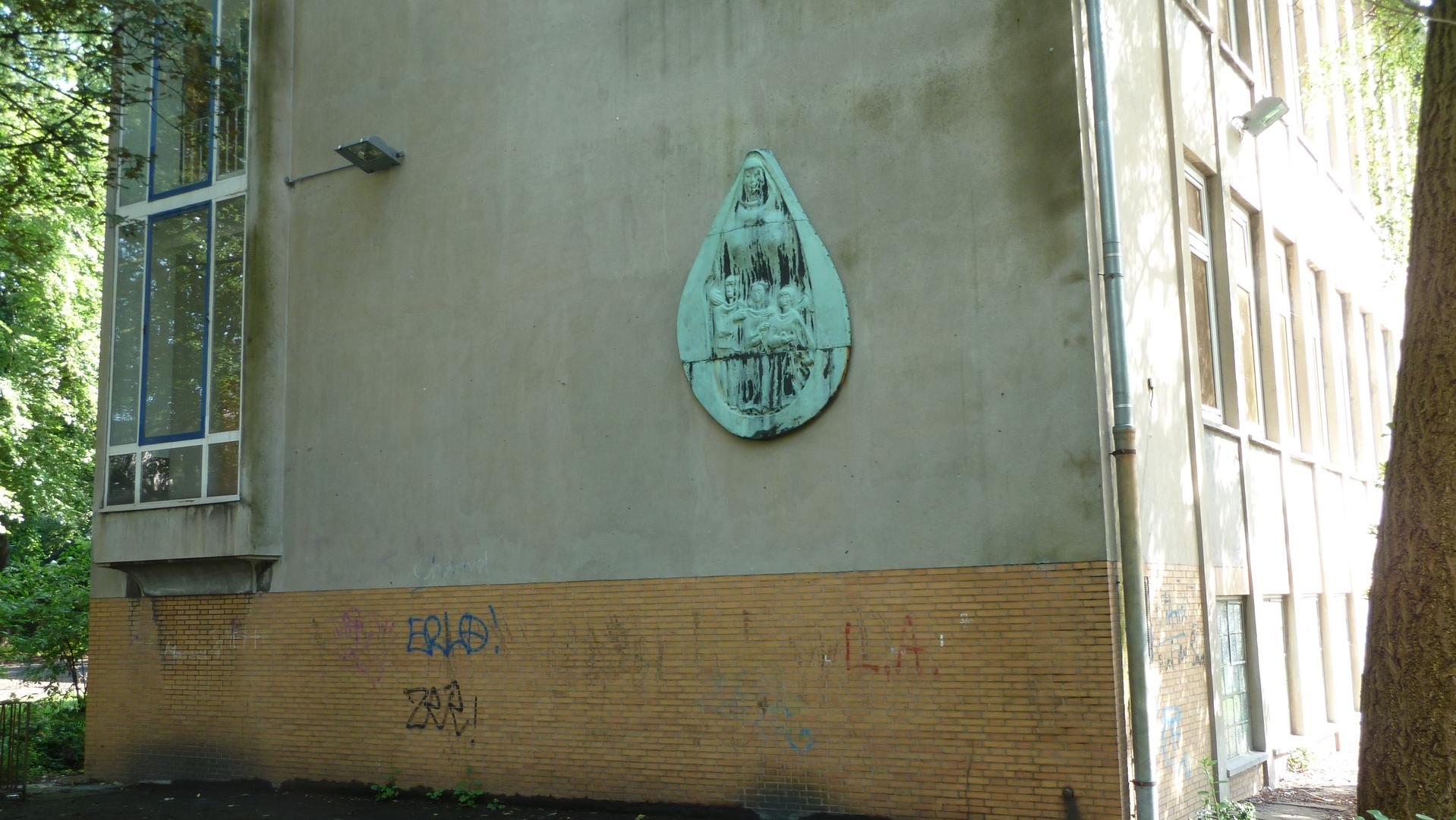 Die Schule an der Stiftstraße wurde ca. 1955 von der Stadt Bochum als katholische Grundschule gebaut. Entgegen der Wünsche des Trägers wurde die Schule nur sehr sparsam mit religiösen oder konfessionellen Symbolen ausgestattet. Die Schutzmantelmadonna an der Giebelseite zur Stiftstraße ist eines dieser Symbole. Allgemeiner kann sie auch als Darstellung zum Thema „Mutter und Kinder“ aufgefasst werden.