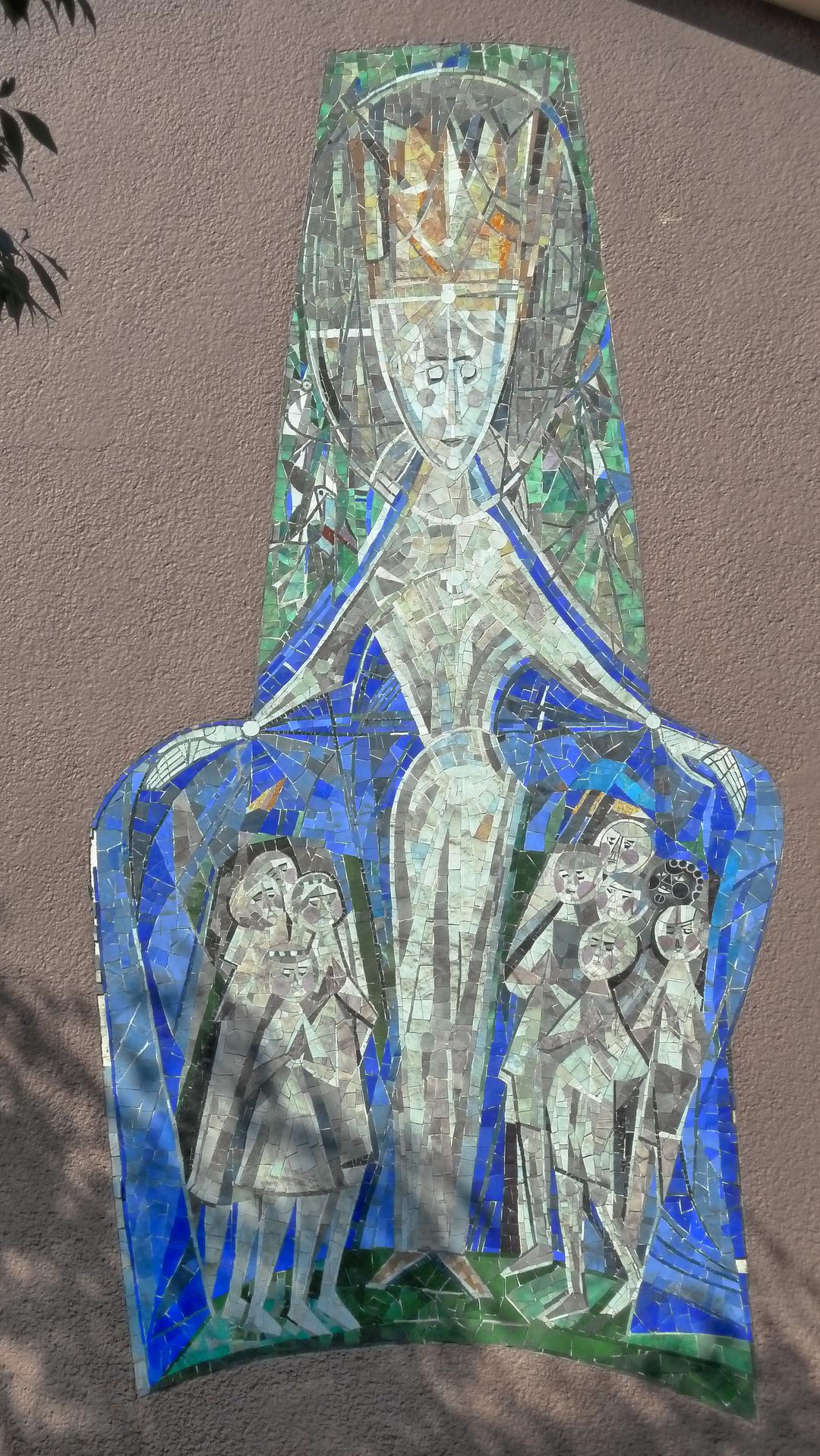 Eine weitere Schutzmantelmadonna, diesmal als Kupferrelief, findet sich an der - ehemals katholischen - Städtischen Gemeinschaftshauptschule an der Stiftstraße.