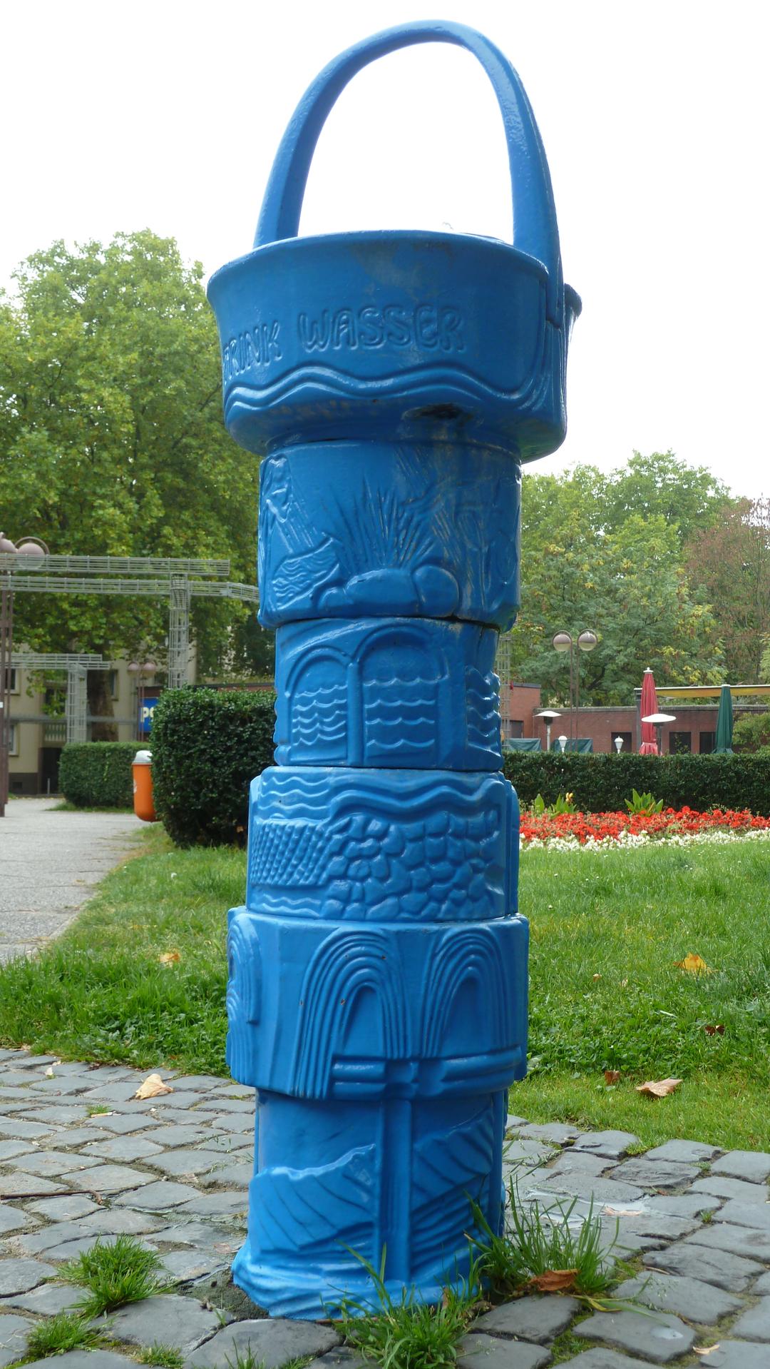 Die gestalterische Idee war, auf der Brunnensäule den Weg des Wassers aus der Tiefe der Erde bis zum Verbraucher darzustellen. Auf fünf übereinanderliegenden Rohrstücken zeigen bildliche Darstellungen