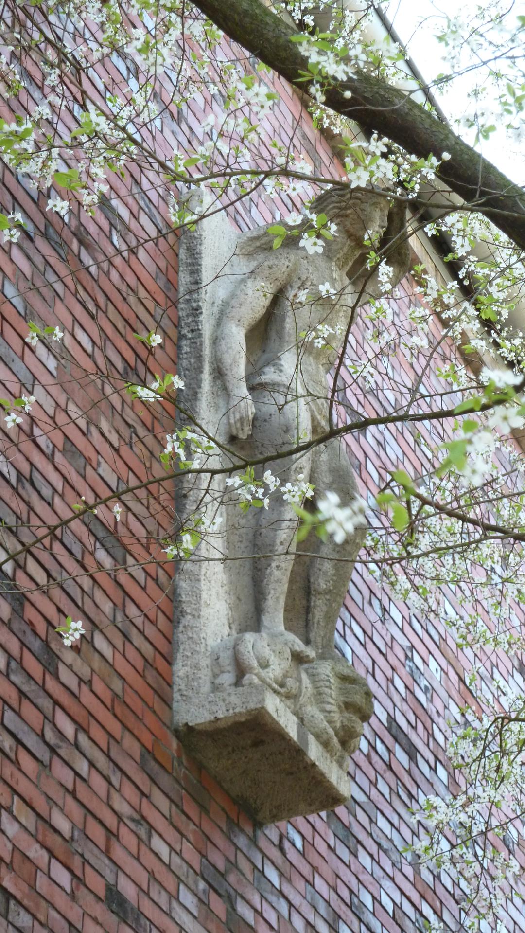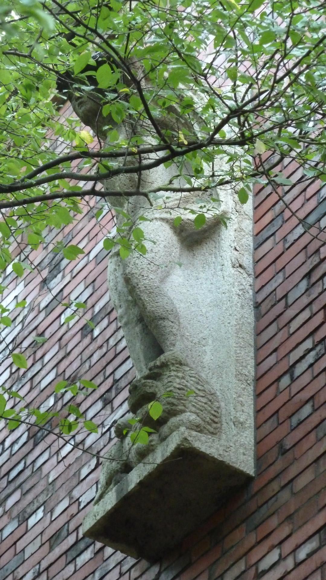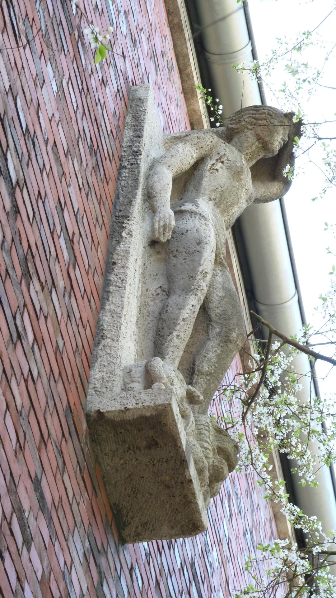 An der Stirnwand der Aula der Schiller-Schule, zum Waldring hin, ist über Kopfhöhe eine Steinskulptur angebracht, die eine Frauengestalt zeigt, die auf einem Löwen steht. Sie zieht das Ende eines Lendentuches wie ein Segel über Rücken und Kopf.