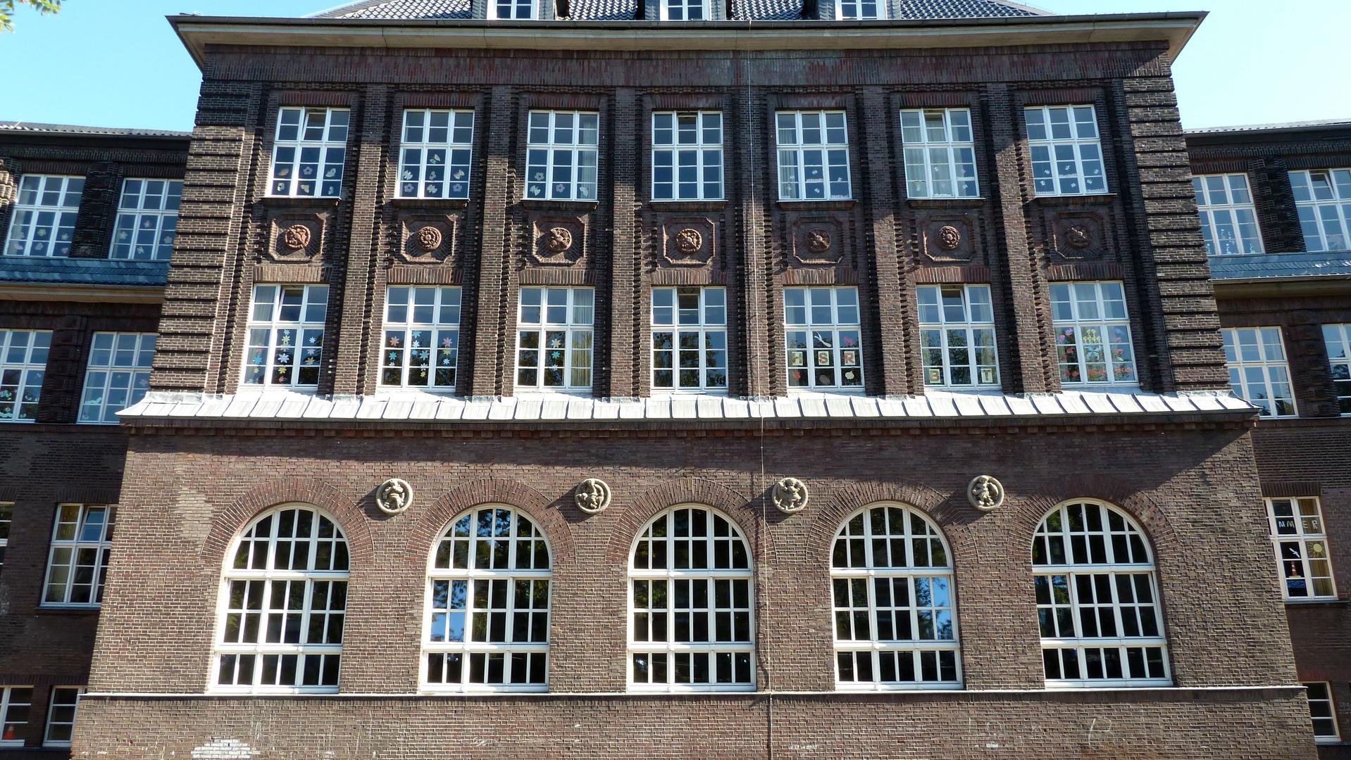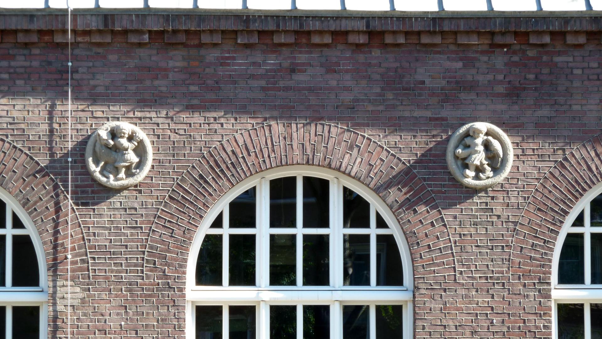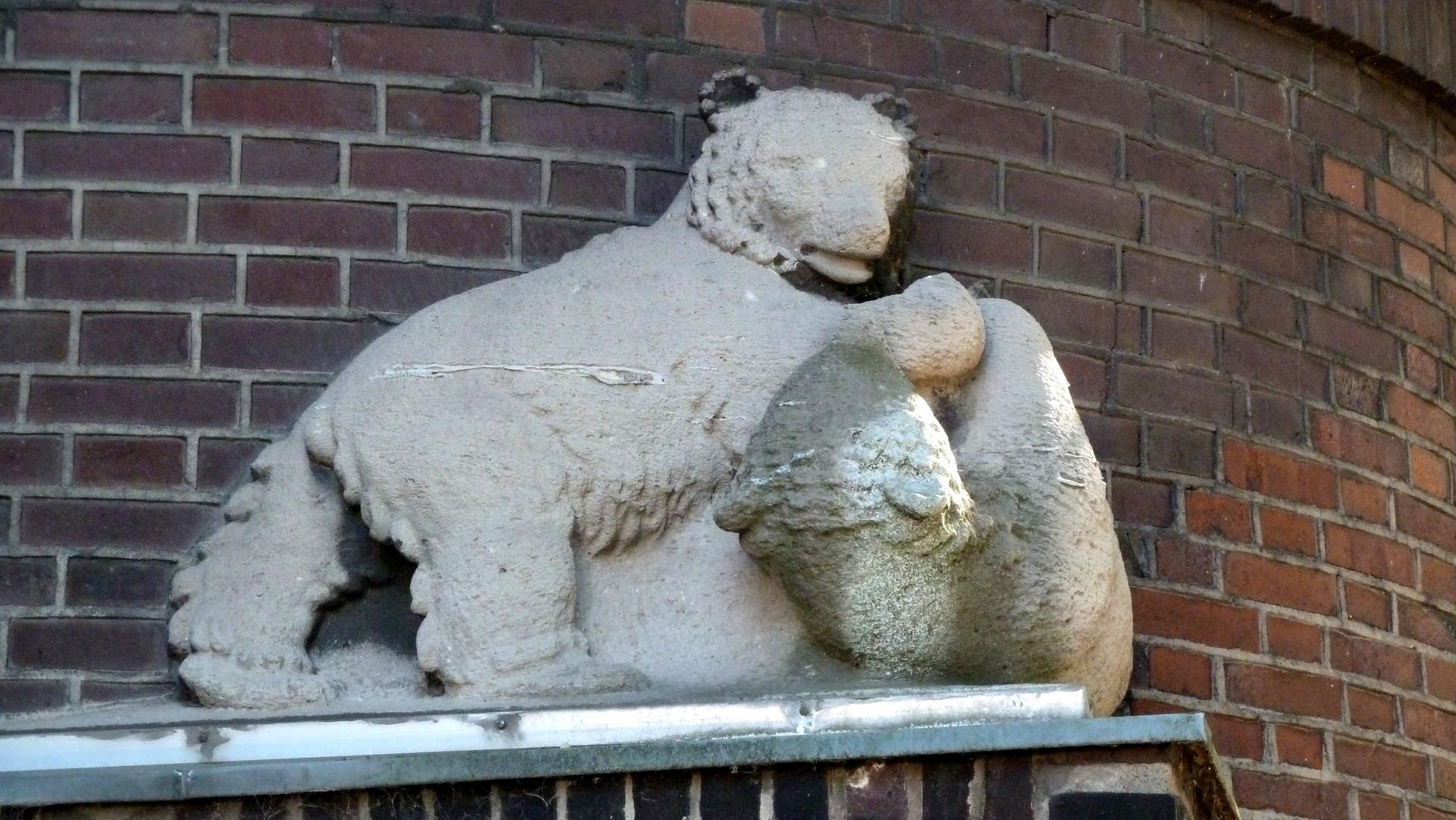 An dem Nebengebäude links neben der Schule befindet sich über einem runden Erker ein Steinrelief, das zwei Bärenjunge im Spiel zeigt.