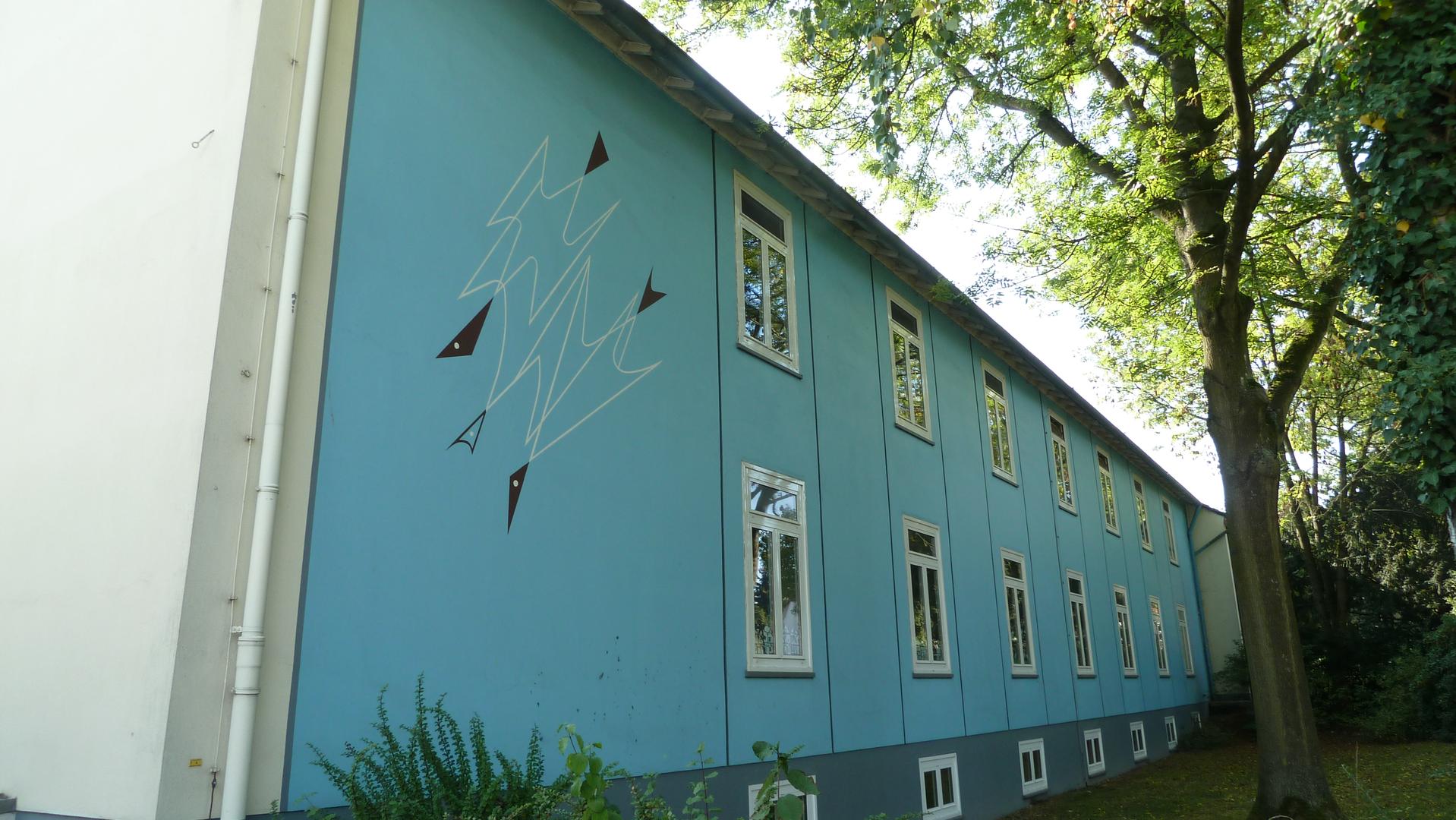 Von unbekannter Hand stammt das Wandbild an der Grundschule Somborner Straße. Die Schule wurde 1956 als Volksschule (Grund- und Hauptschule) erbaut.