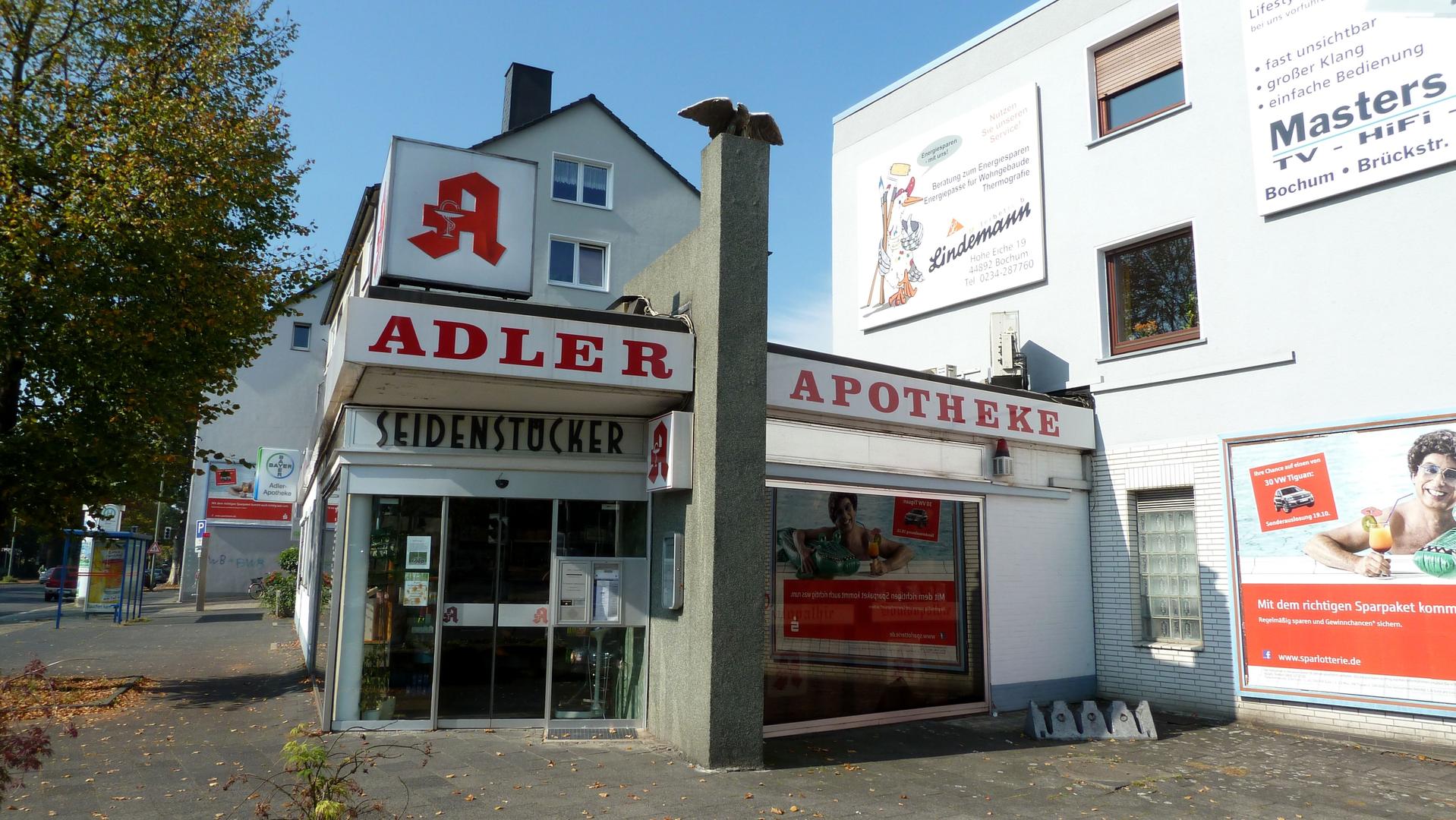 Die Adler-Apotheke, gegründet 1861 an der Hauptstraße 142, ist die älteste Apotheke in Langendreer. Hermann Seidenstücker übernahm die Apotheke 1911. Seit 1903 thront der Bronze-Adler über Langendreer. Die alte Apotheke wurde im Krieg schwer beschädigt und schließlich zog die Apotheke 1961 in den Neubau an der Unterstraße. Heute wird sie in der dritten Generation von der Familie Seidenstücker geführt. Der Adler war immer dabei. Das gute Stück wurde 1989 restauriert. Ob es sich um einen individuellen Entwurf oder ein kunstgewerbliches Objekt handelt, muss offen bleiben.
