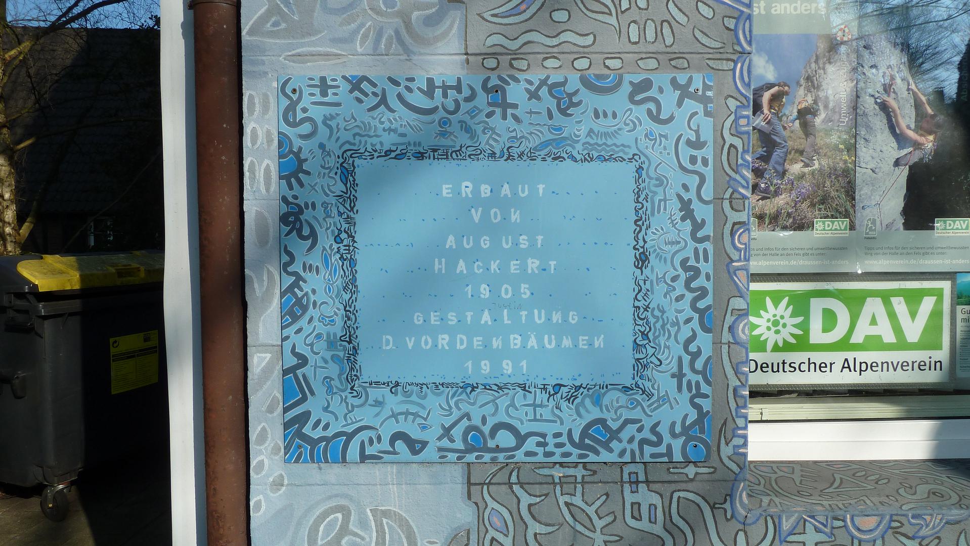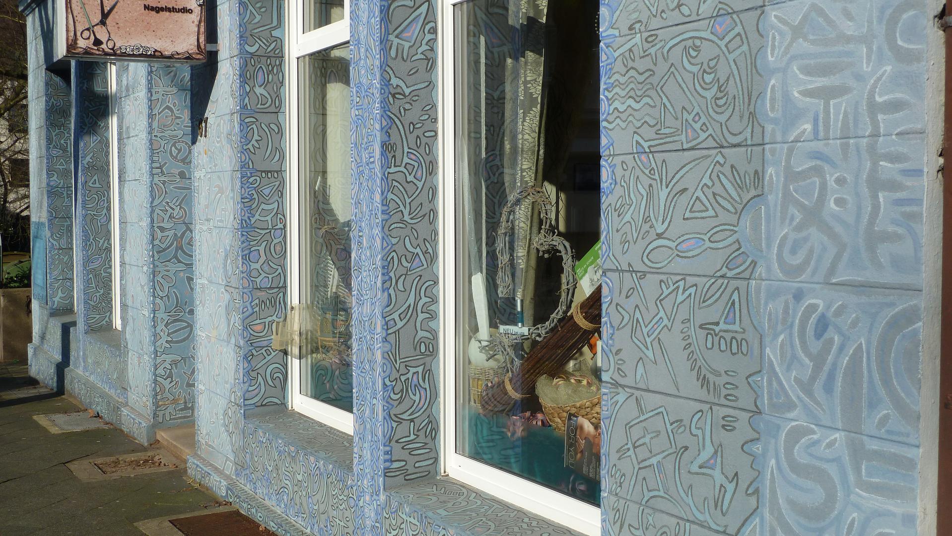 Zuerst ist nur der Grundton blau sichtbar. Erst bei näherem Hinsehen werden auf diesem Hintergrund die für Vordenbäumen typischen, an Graffiti erinnernden hieroglyphenartigen Symbole sichtbar. Sie sind wechselnd in freier Anordnung oder als sich wiederholendes Muster aufgetragen. Die Reihung und damit die strengere Bindung an die architektonische Vorlage findet sich zumeist in der Nähe von Fenster - und Türrahmungen. Die Bemalung nimmt die bereits vorgegebene Struktur der Fassade auf.
